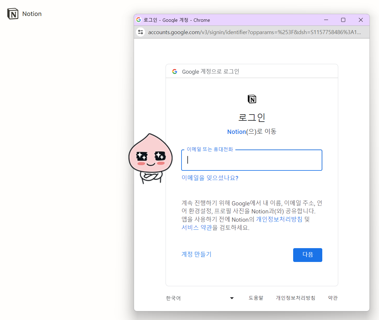 이 상태에서 다시 노션 로그인 화면으로 가보겠습니다.