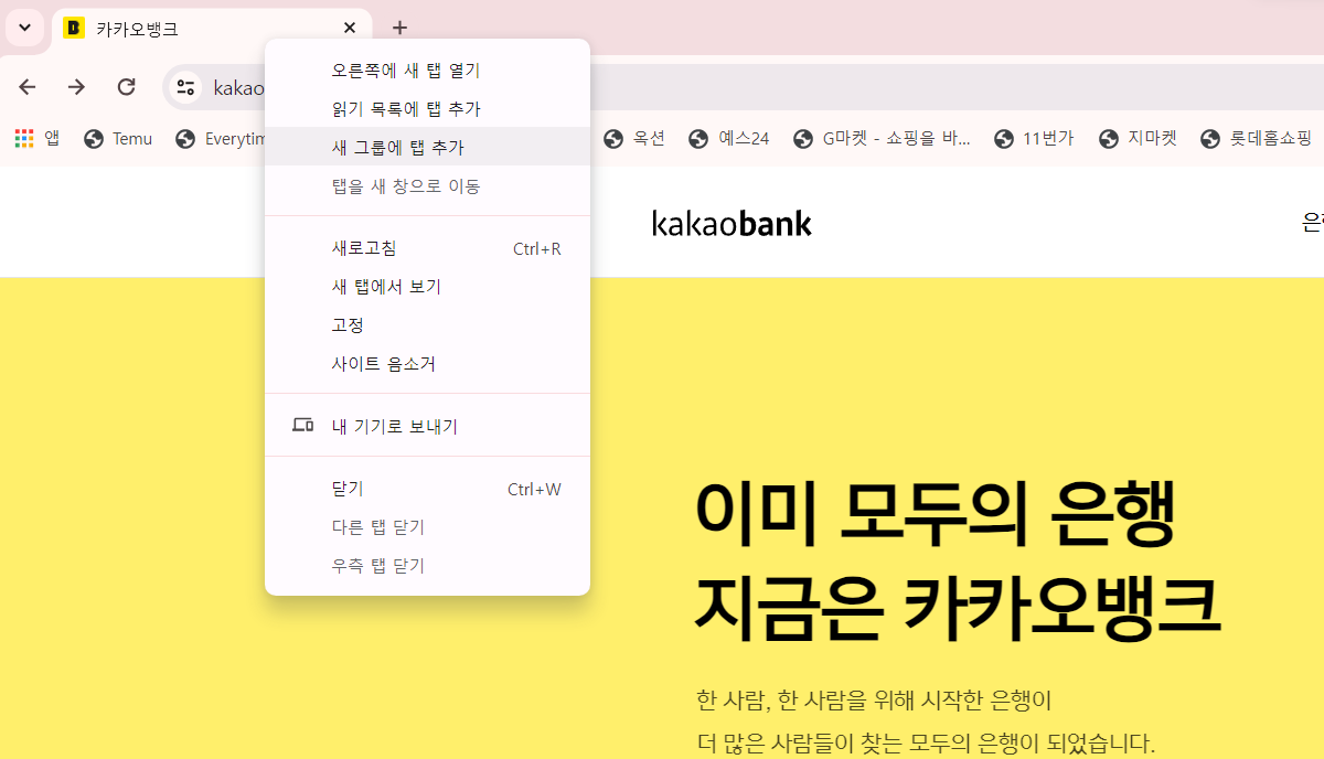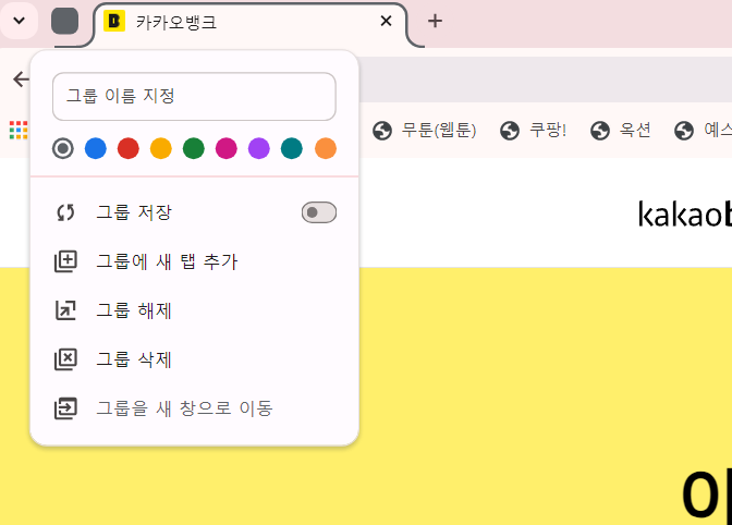 1.탭 위에 마우스를 대고 오른쪽 버튼 클릭 후 "새 그룹에 탭 추가" 선택
