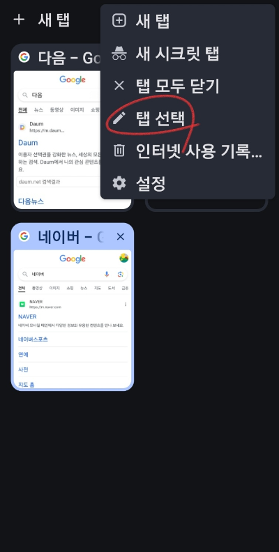 탭 전환 메뉴 (⋮)를 클릭하고 "탭 선택"을 선택하여 그룹할 탭을 선택한 뒤