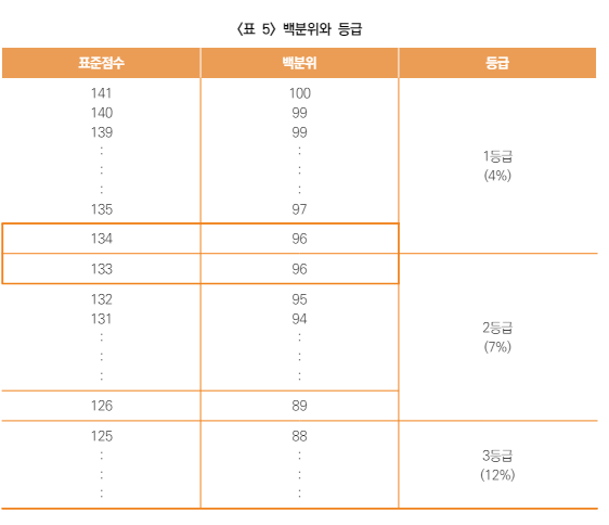 백분위가 동일하더라도 표준 점수가 다른 경우 등급이 달라질 수 있습니다.