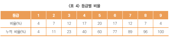 그 다음 7%까지를 2등급 등으로 하여 <표 4>와 같이 순차적으로 등급을 부여합니다.